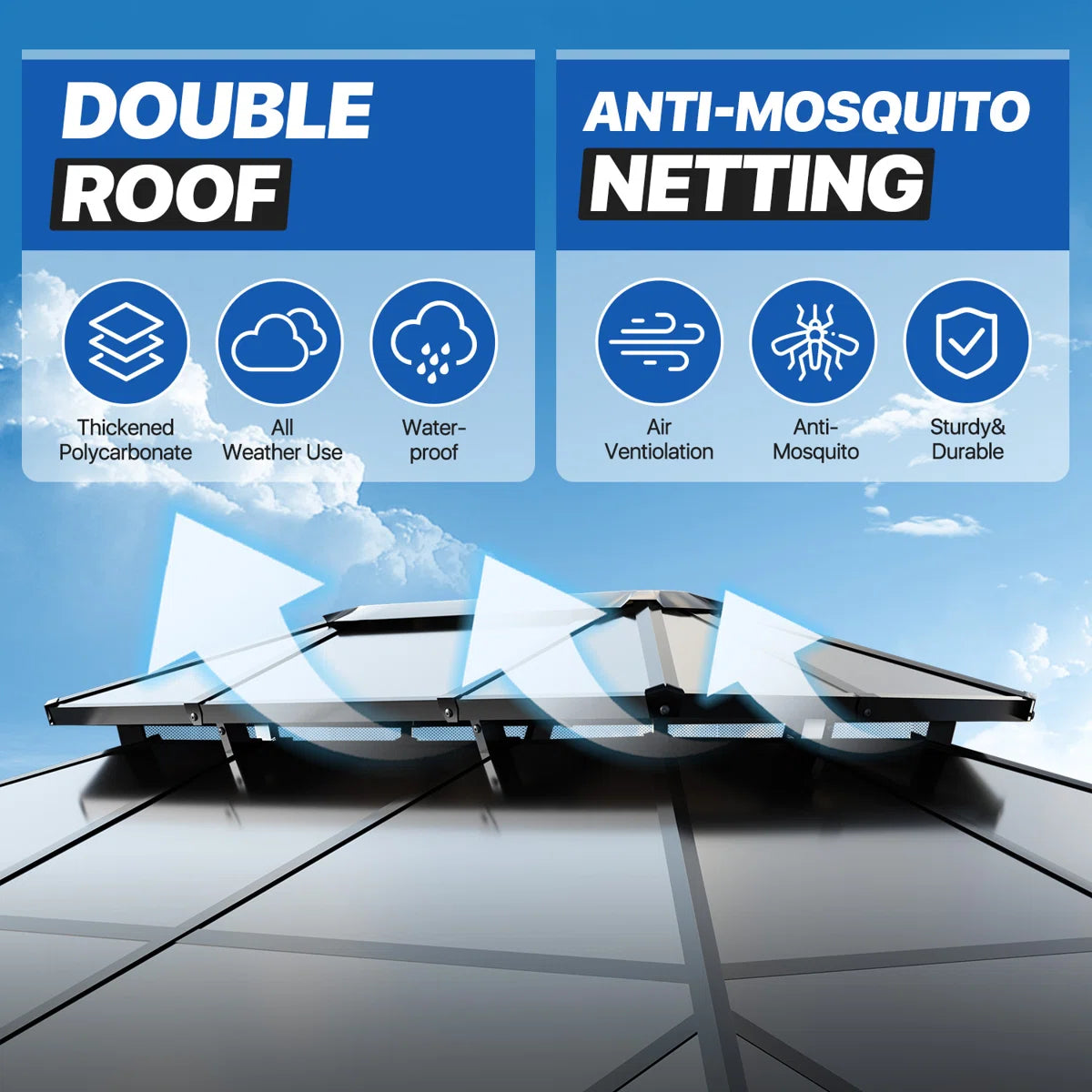 - Enhance stability and durability with our outdoor gazebo. The polycarbonate dual-layer roof boosts durability, ensuring resilience against winds, rain, and elements. Improve airflow and ventilation while protecting from harmful UV rays.