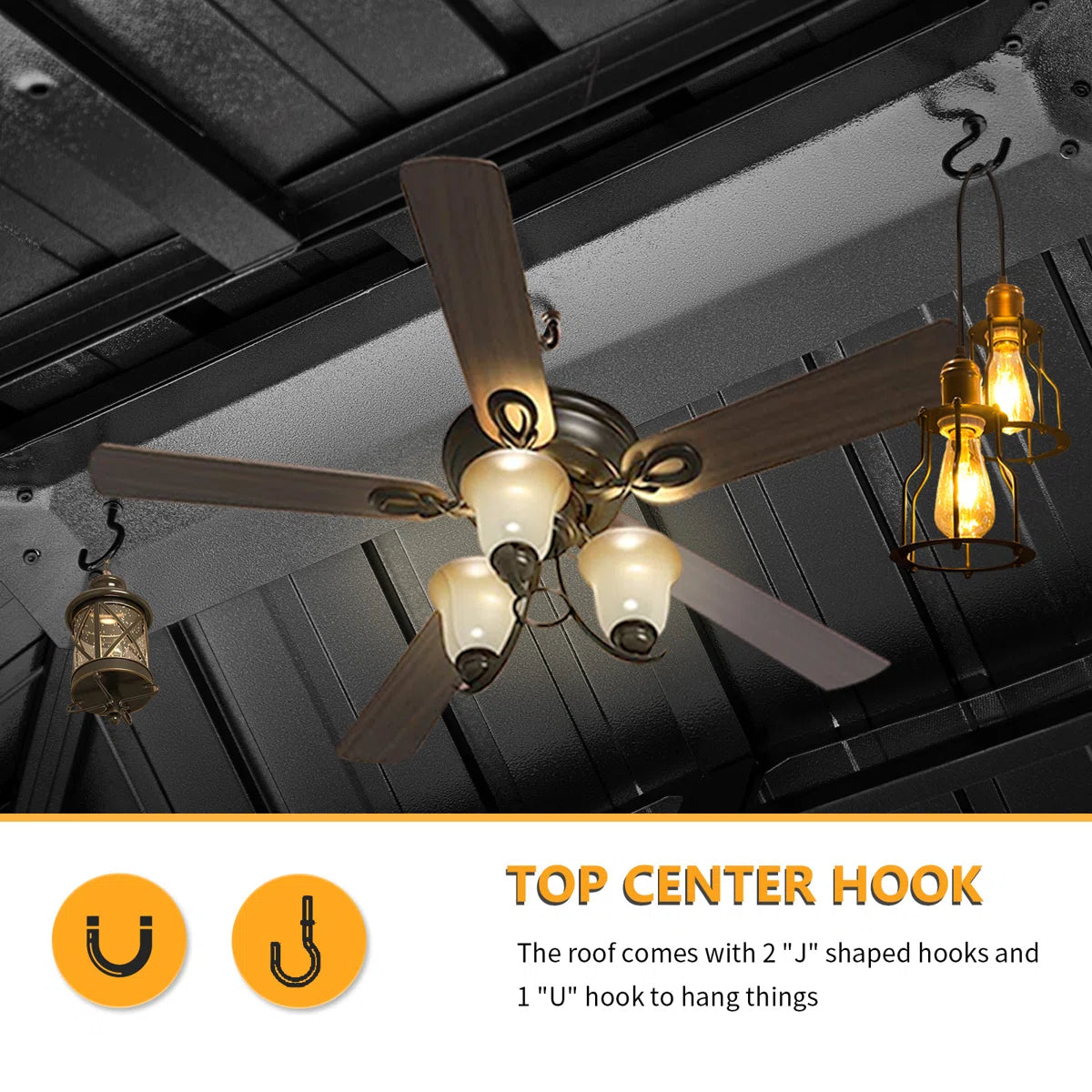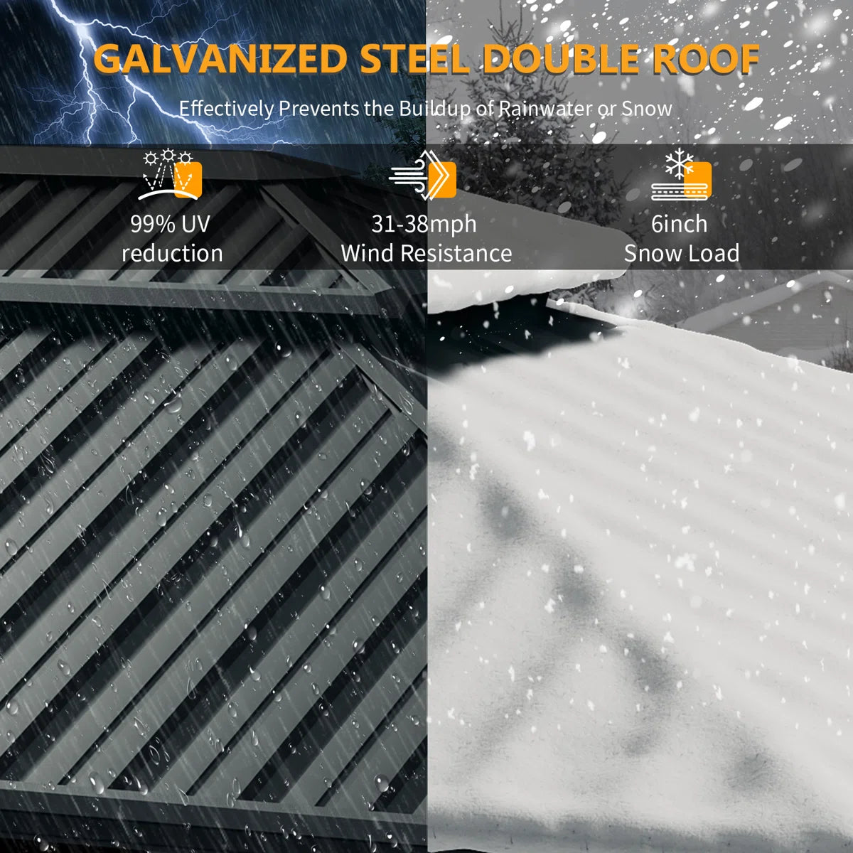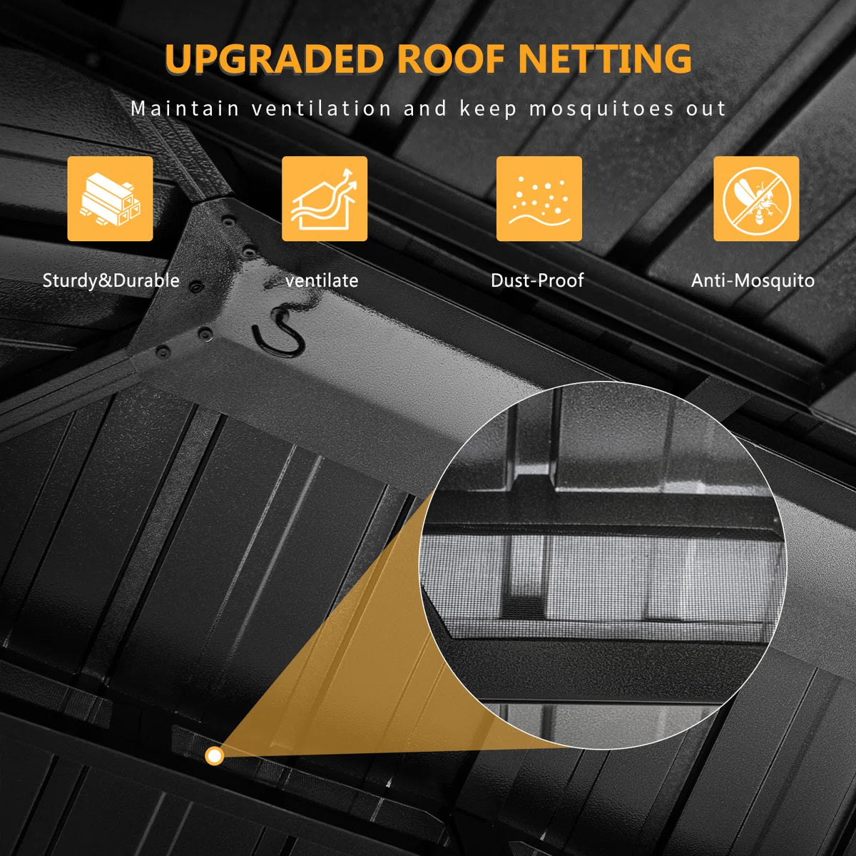 - Vented Double Hardtop: Compared to a single-layer design, this double gazebo canopy allows sunlight to filter through and provides excellent airflow. The galvanized steel metal top can withstand heavy snow, ensuring privacy, safety, and a cool room.