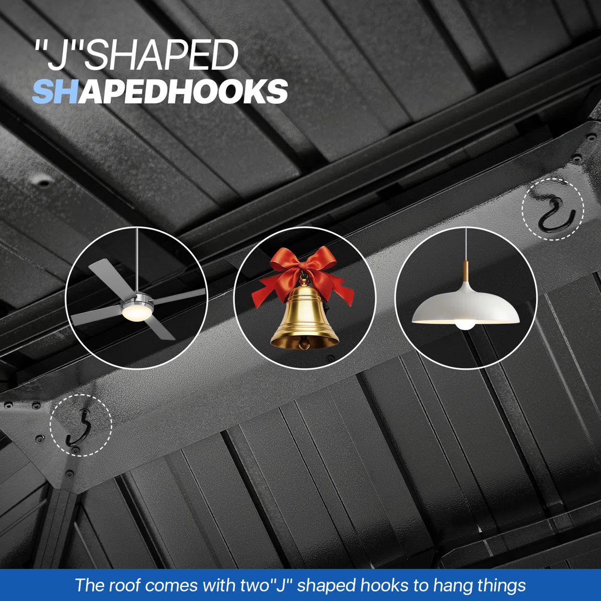 - 12'x10' features 8 industrial-strength hooks (44 lb capacity each) - perfect for hanging pendant lights, outdoor speakers or even small patio heaters. Comfortably fits 6-person dining sets.