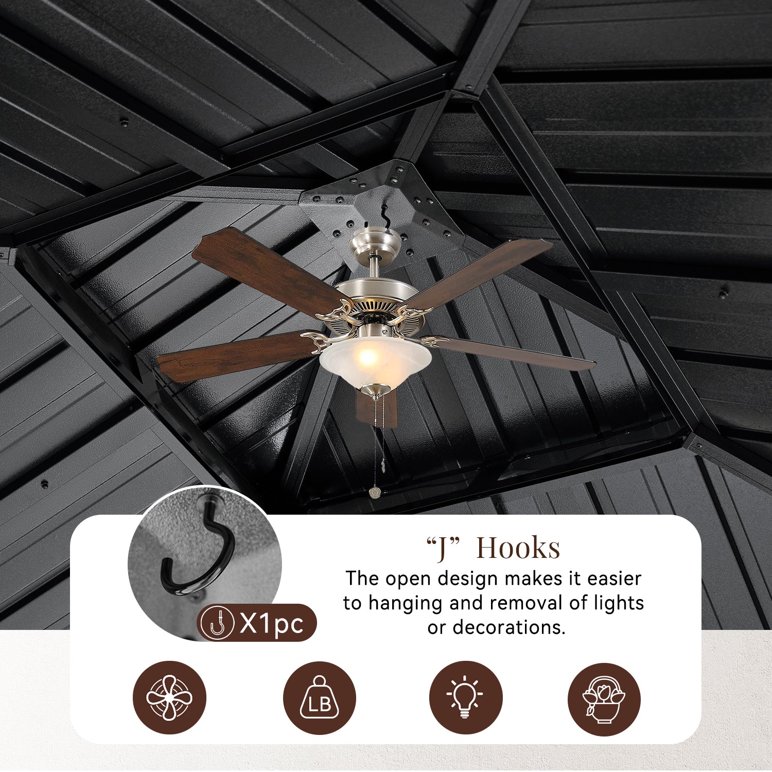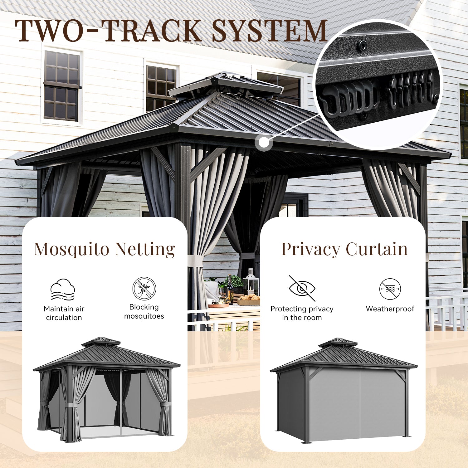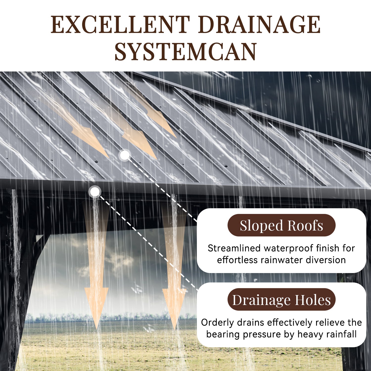 - Galvanized Roof And Gutter Design: This hardtop gazebo is constructed with a powder-coated, galvanized steel roof that is strong and durable enough to withstand harsh weather. In addition, the galvanized design makes it less likely to rust or corrode, greatly extending its lifespan. The professional drainage system is designed to allow water to flow from the top of the arbor to the columns and the ground, greatly reducing the problem of rain and snow accumulation.
