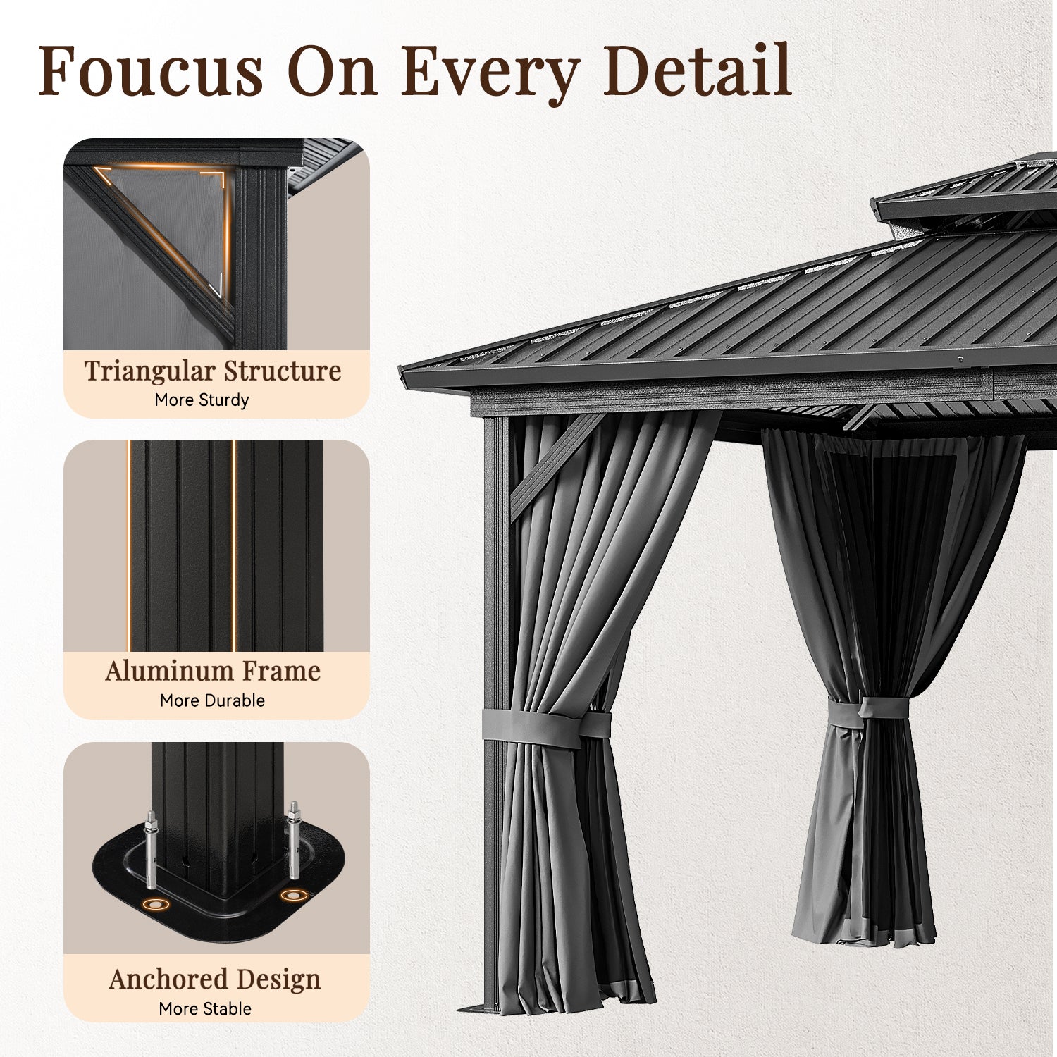 - Strong Aluminum Frame: Our products are constructed with a triangular shape, which greatly enhances overall stability and durability. This patio gazebo is designed with a sturdy aluminum alloy frame with an environmentally friendly, high-performance, weather-resistant powder-coated surface that does not easily scratch, peel, corrode or rust. Note: Maximum wind rating: 7 (31-38 mph)