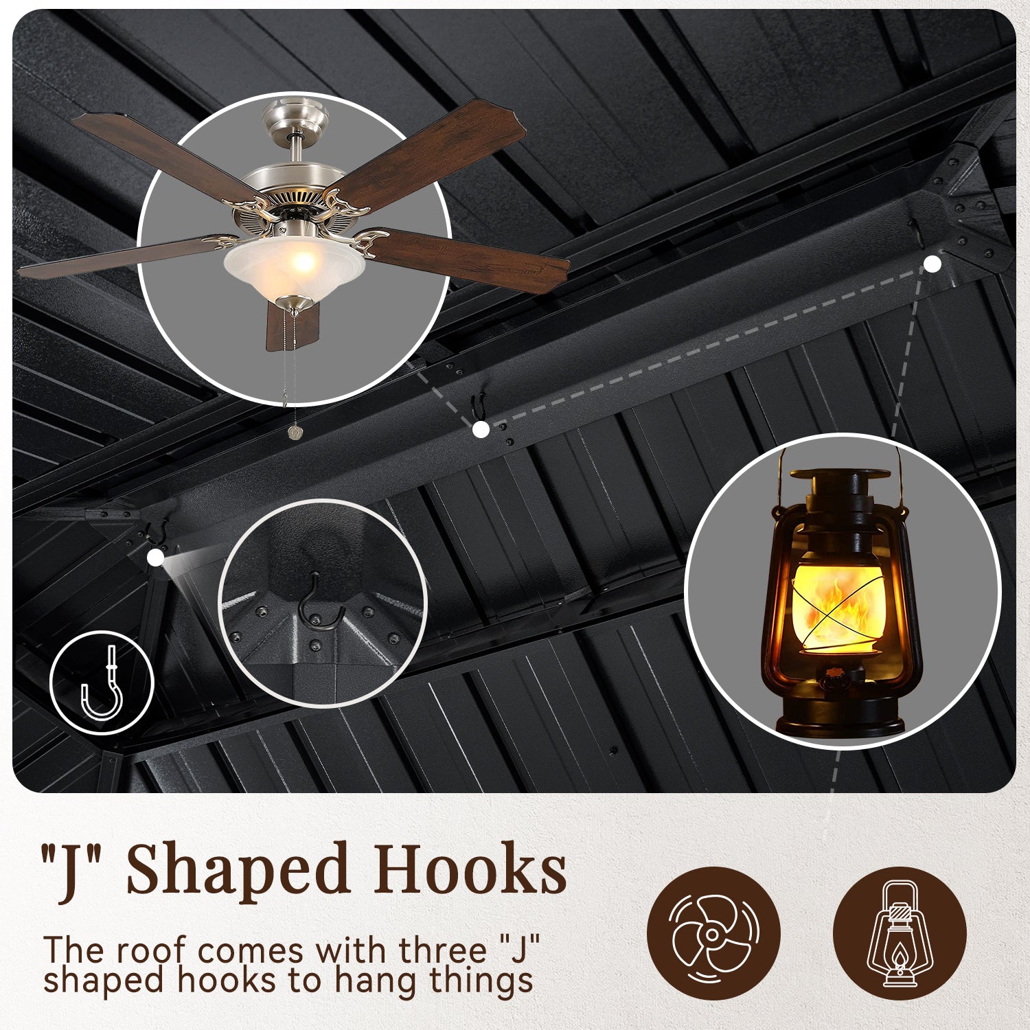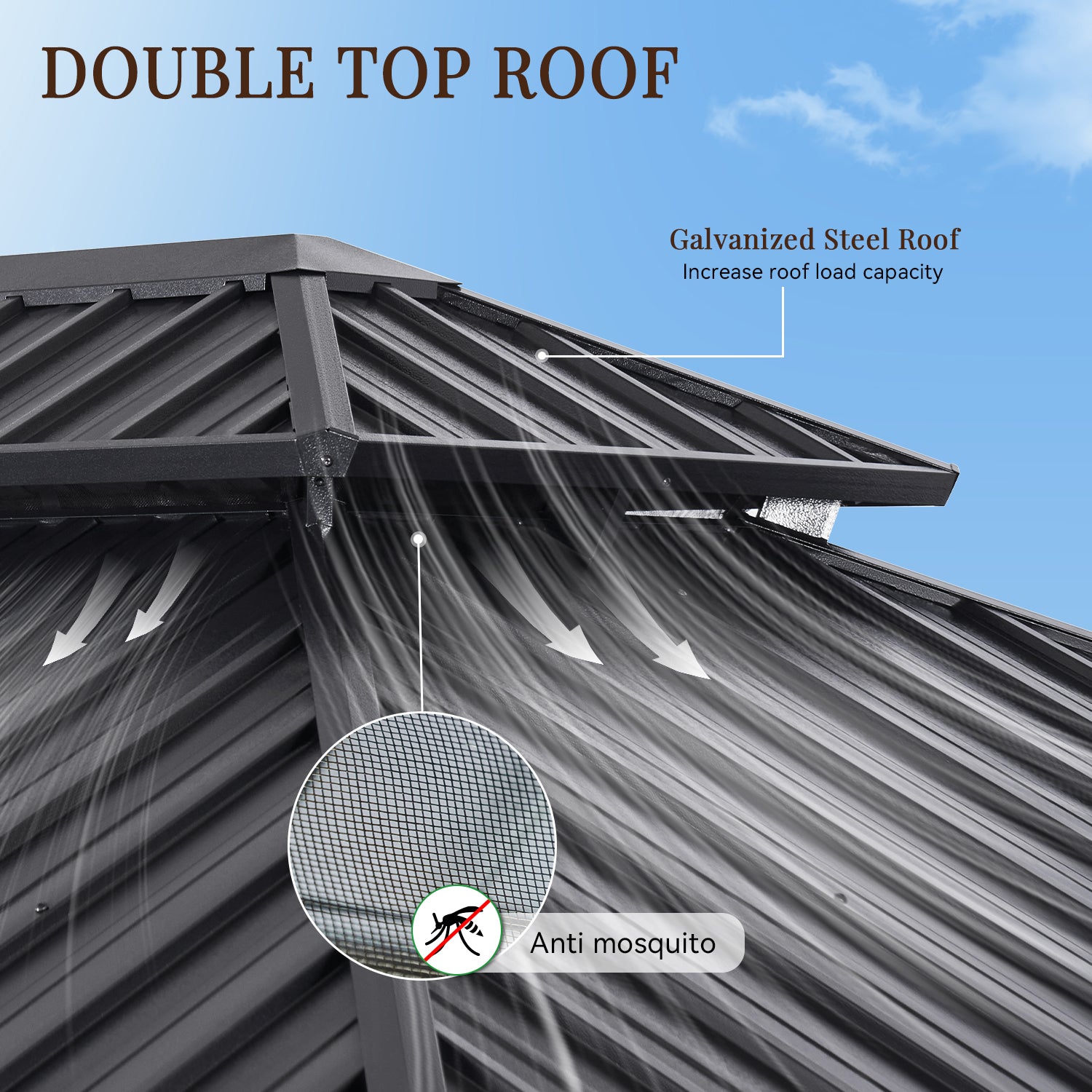 - Galvanized Steel Roof And Gutter Design: This hardtop gazebo is constructed with a powder-coated, galvanized steel roof that is strong and durable enough to withstand harsh weather. In addition, the galvanized design makes it less likely to rust or corrode, greatly extending its lifespan. The professional drainage system is designed to allow water to flow from the top of the arbor to the columns and the ground, greatly reducing the problem of rain and snow accumulation.
