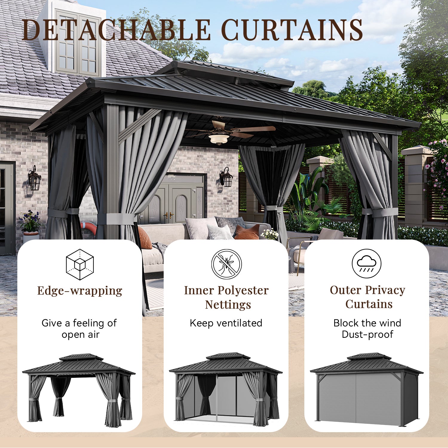 - Spacious Space: The gazebo measures 14.0' W X 10.0' D X 10.0' H, providing ample space for multiple people to engage in various activities, including large gatherings, outdoor dining, and parties. Its spacious design creates an open and welcoming atmosphere, making it a cozy space for people to interact and move around.