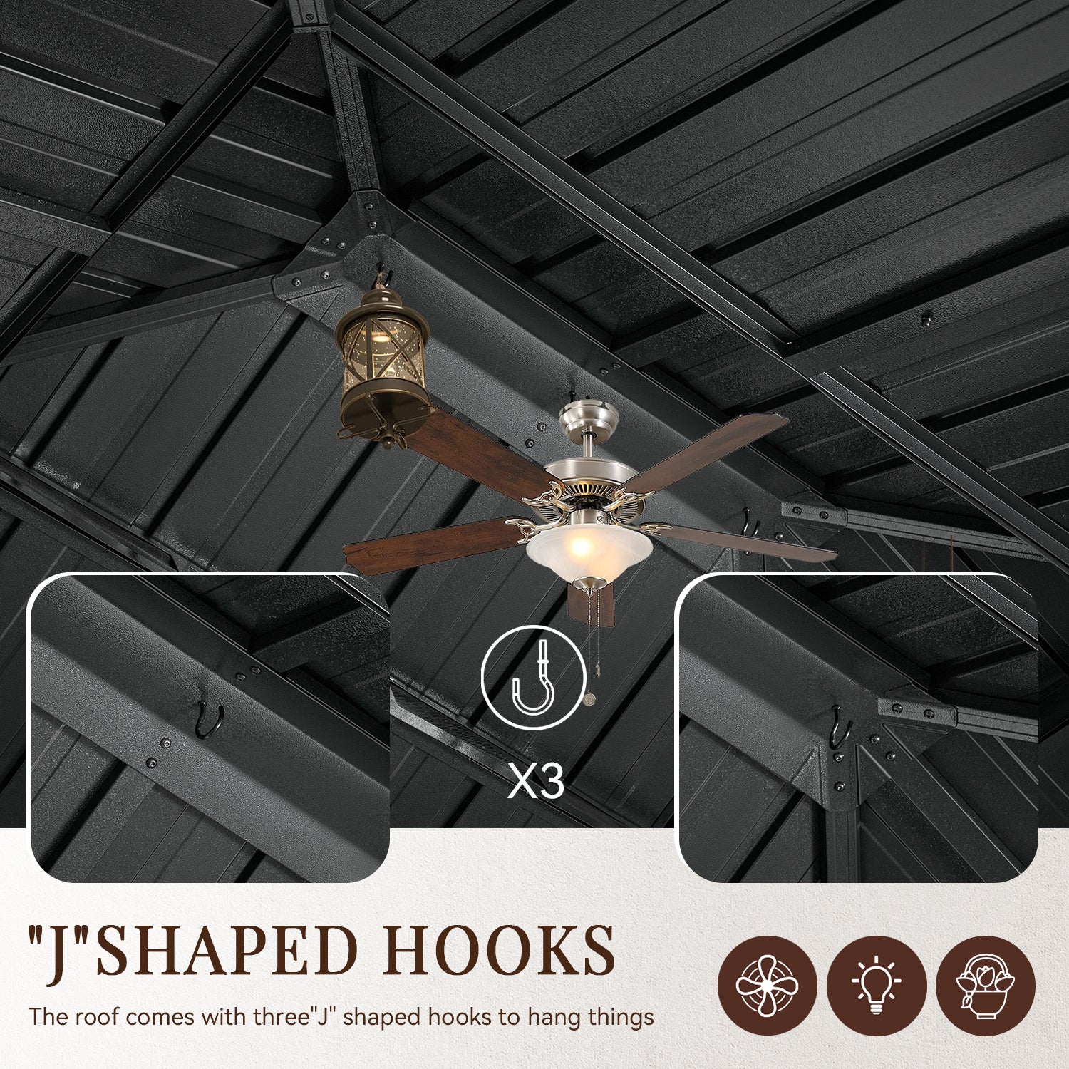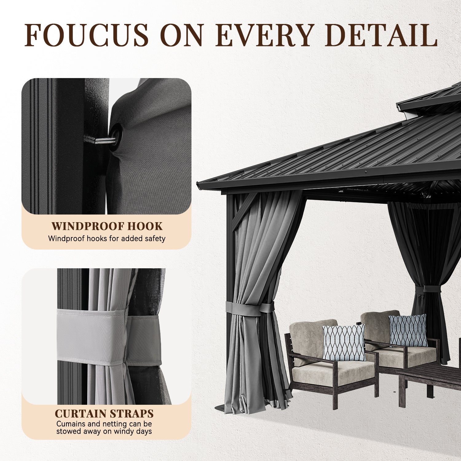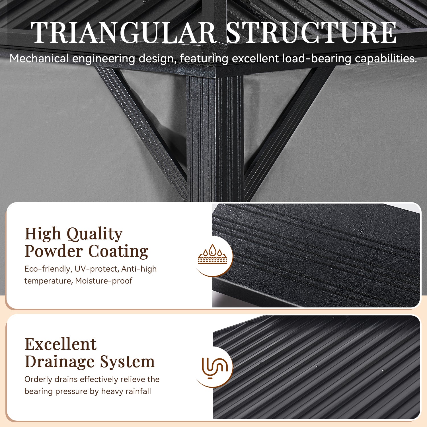 - Galvanized Steel Roof And Gutter Design: This hardtop gazebo is constructed with a powder-coated, galvanized steel roof that is strong and durable enough to withstand harsh weather. In addition, the galvanized design makes it less likely to rust or corrode, greatly extending its lifespan. The professional drainage system is designed to allow water to flow from the top of the arbor to the columns and the ground, greatly reducing the problem of rain and snow accumulation.