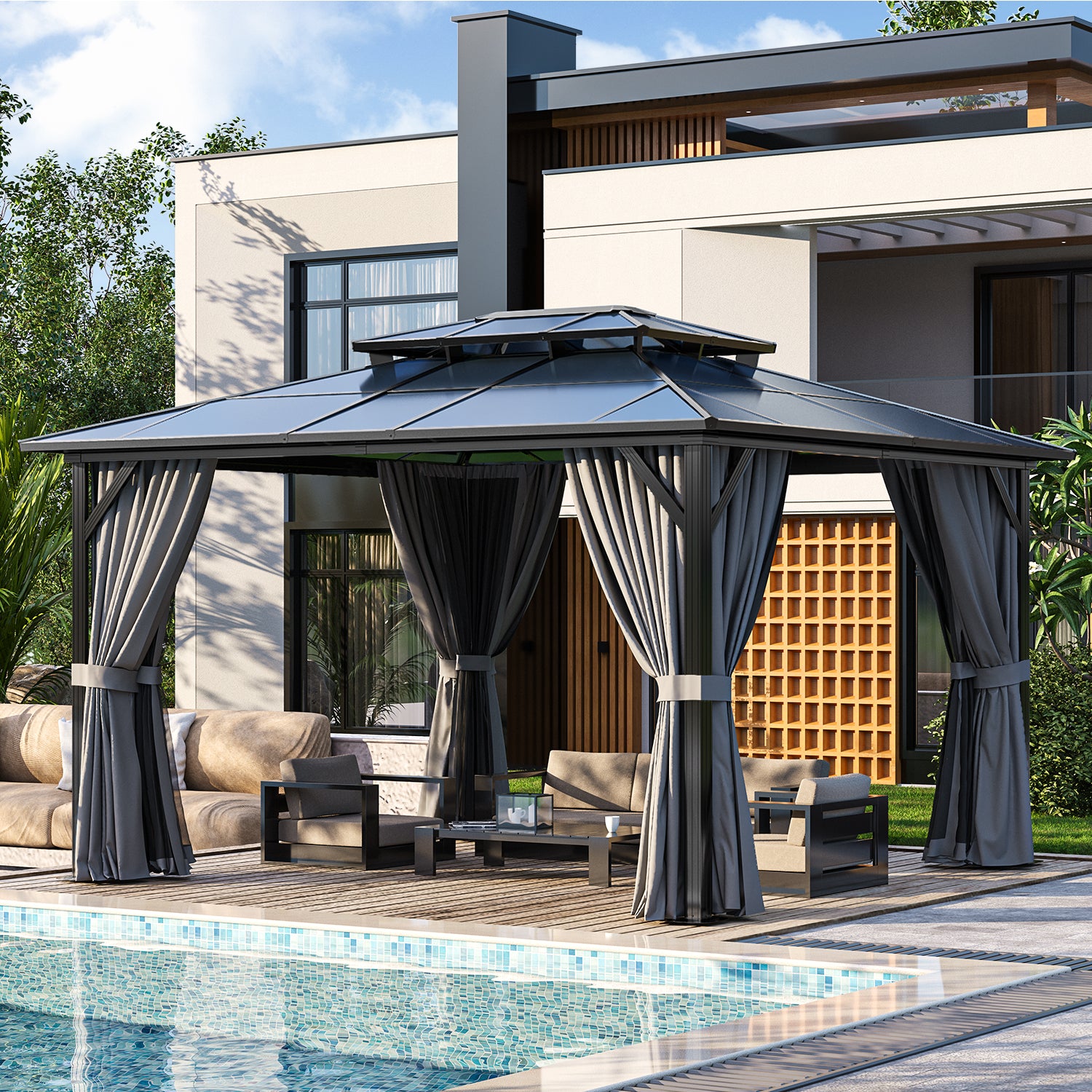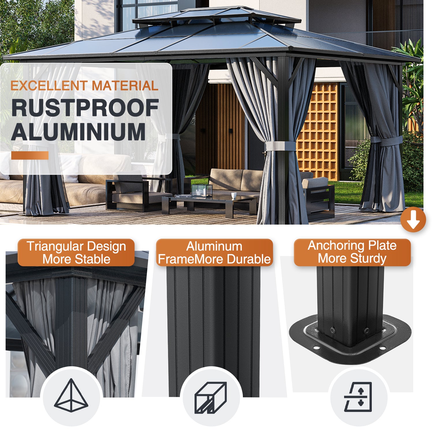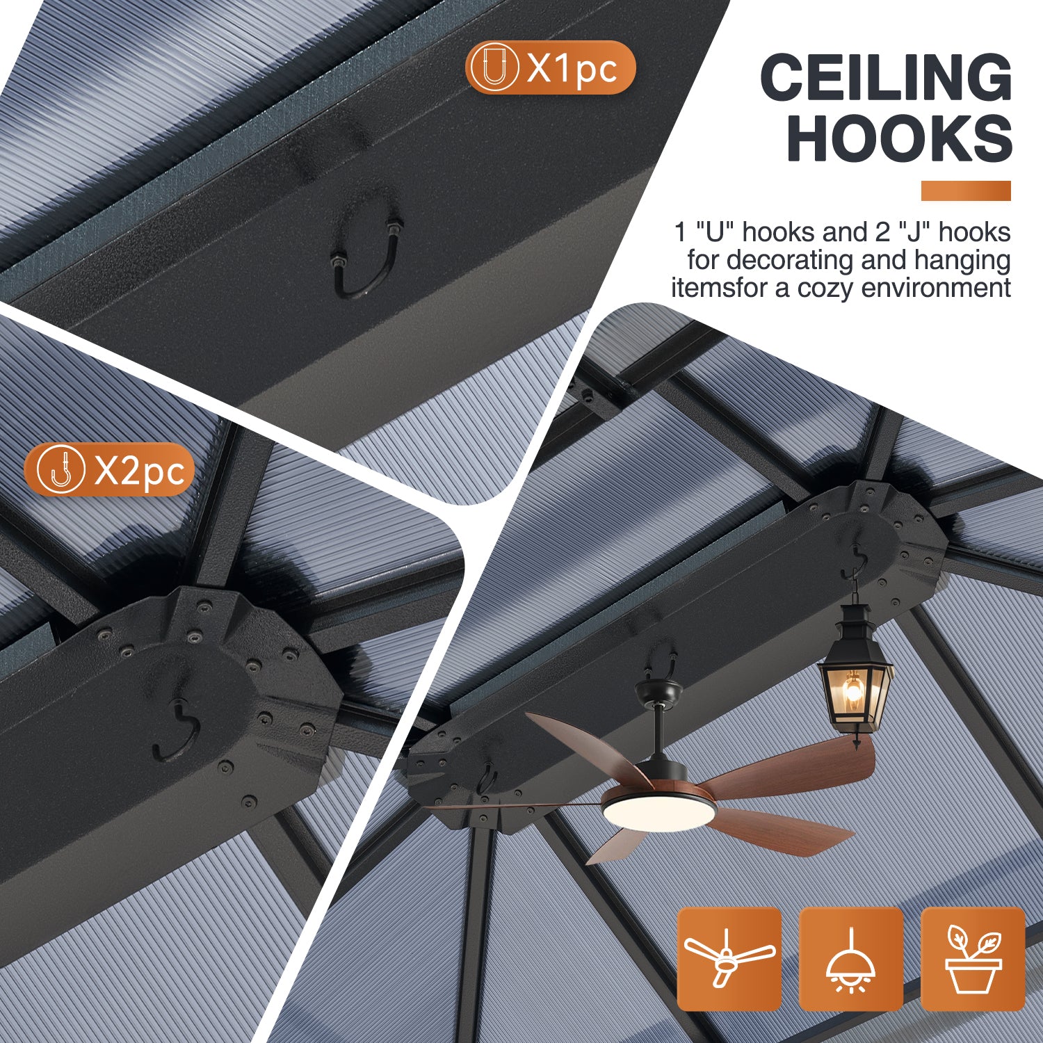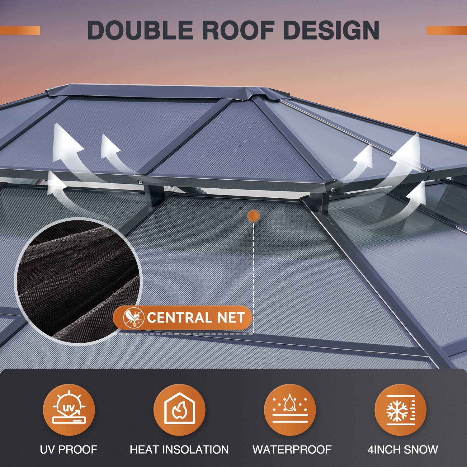 - Practical Double-Top - The double-layer roof is designed with a stable structure and a sensible slope for natural rain and snow runoff. The roof is made of 6mm thick waterproof polycarbonate, capable of bearing 3 to 5 inches of snow. With a built-in mosquito net at the top, you can relax without worrying about insects, leaves, or debris falling.