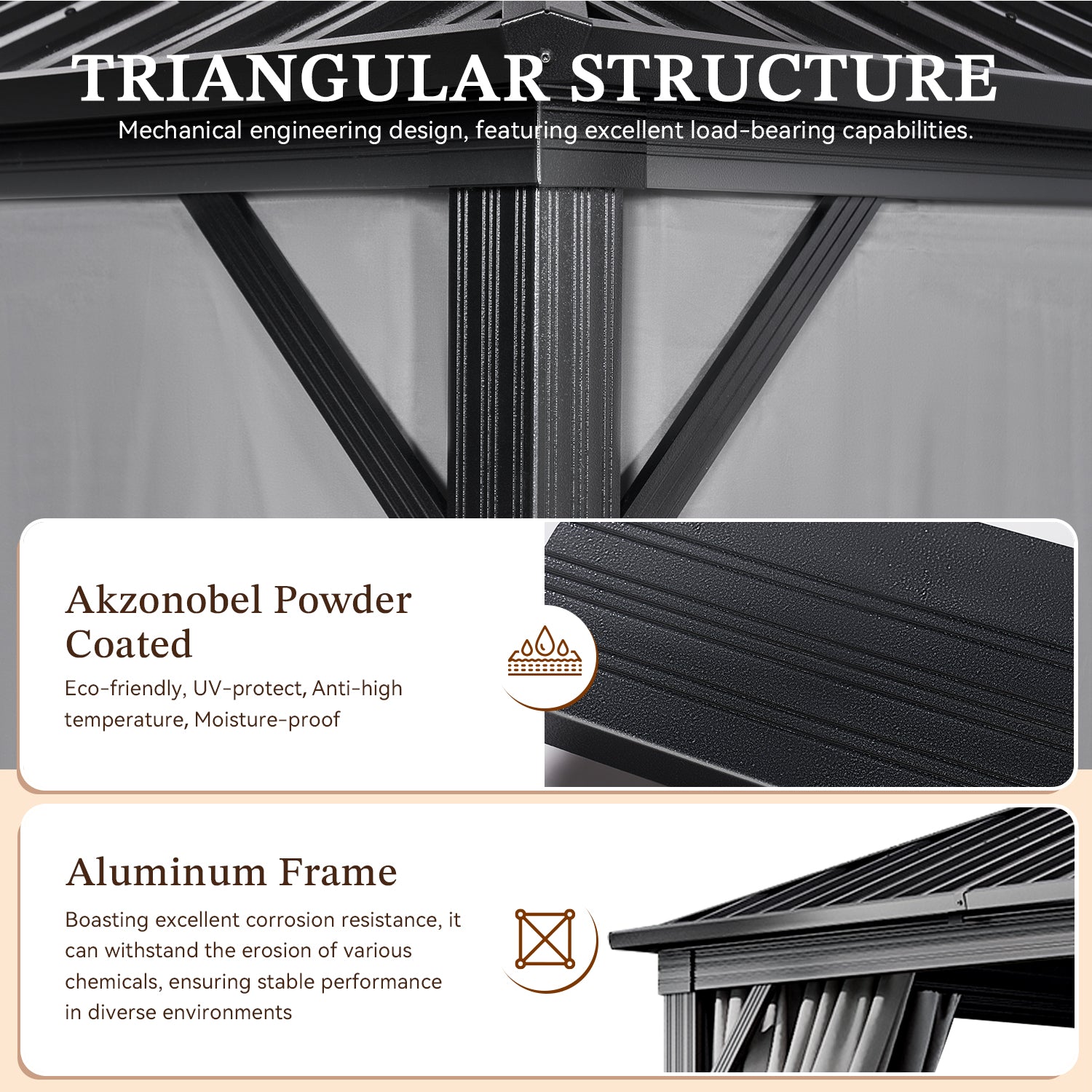 - Aluminum Frame: Made of sturdy aluminum frames with a more environmentally friendly, high performance, high weather resistance powder coat finish that is not easy to scratch, peel, corrode, or rust, the patio gazebo is durable enough and can withstand long-time use. Triangular structure improves the overall stability and expansion screws are provided.