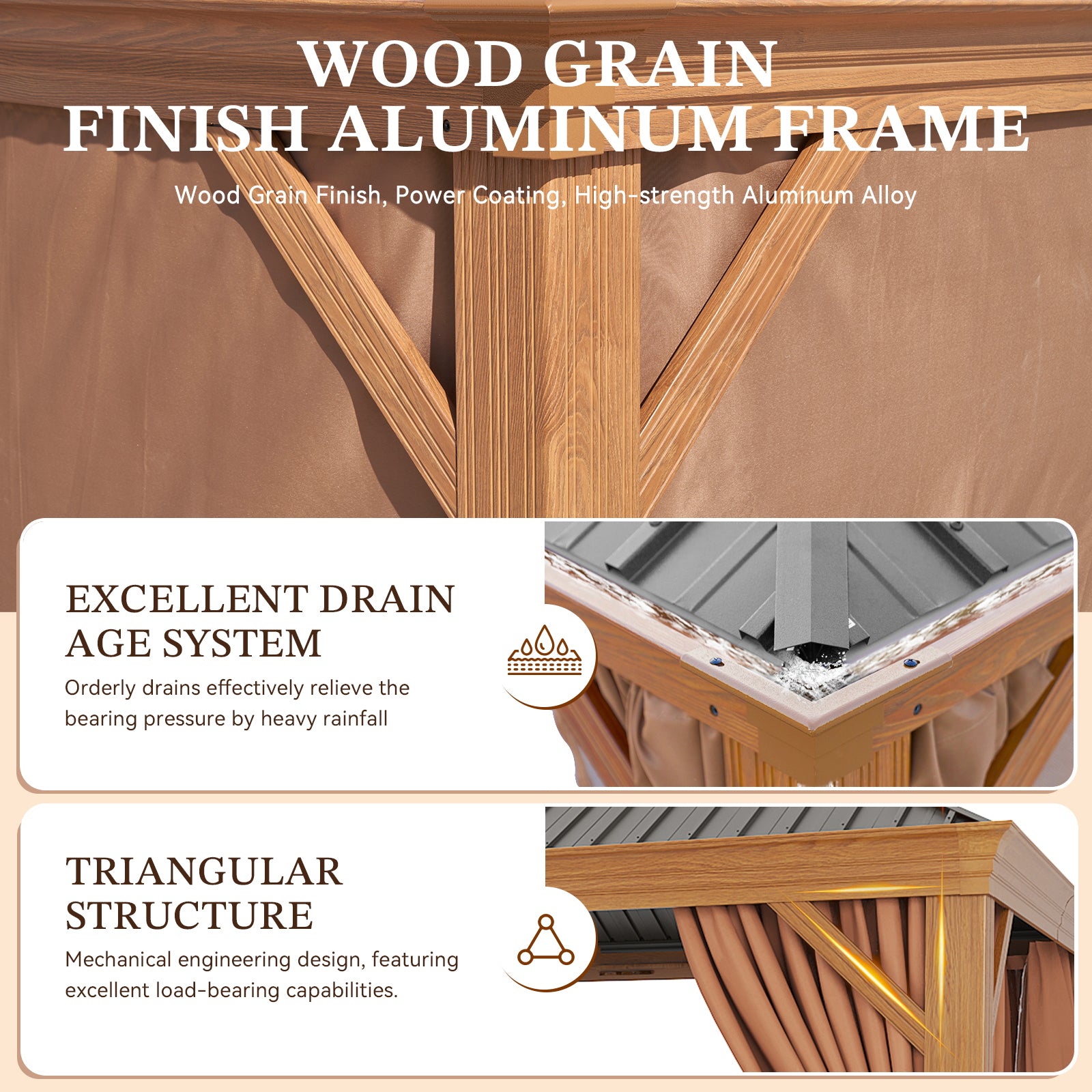 - Reinforced Aluminum Frame with Wood Grain: There are expansion screws supplied to make sure the stability of our backyard gazebo and triangle structure further enhances the overall stability. The adoption of the thermal transfer printing technique makes the frames look like natural wood. The aluminum frame is anti-corrosive and can withstand long-time use. The triangle structure makes it more solid.