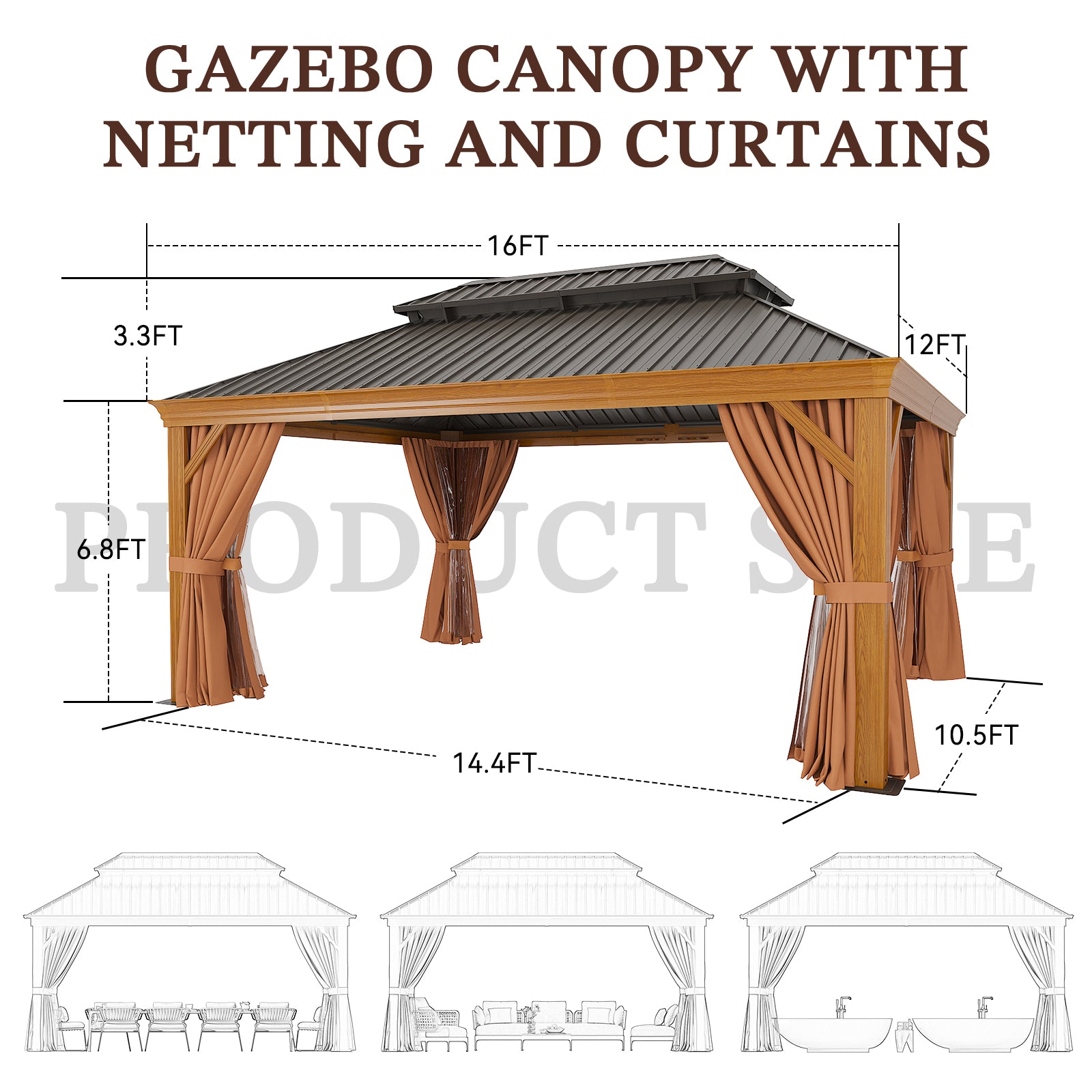 16Ft. W x 12Ft. D Outdoor Cedar Framed Gazebo with Steel Hardtop Permanent Wooden Finished Pavilion