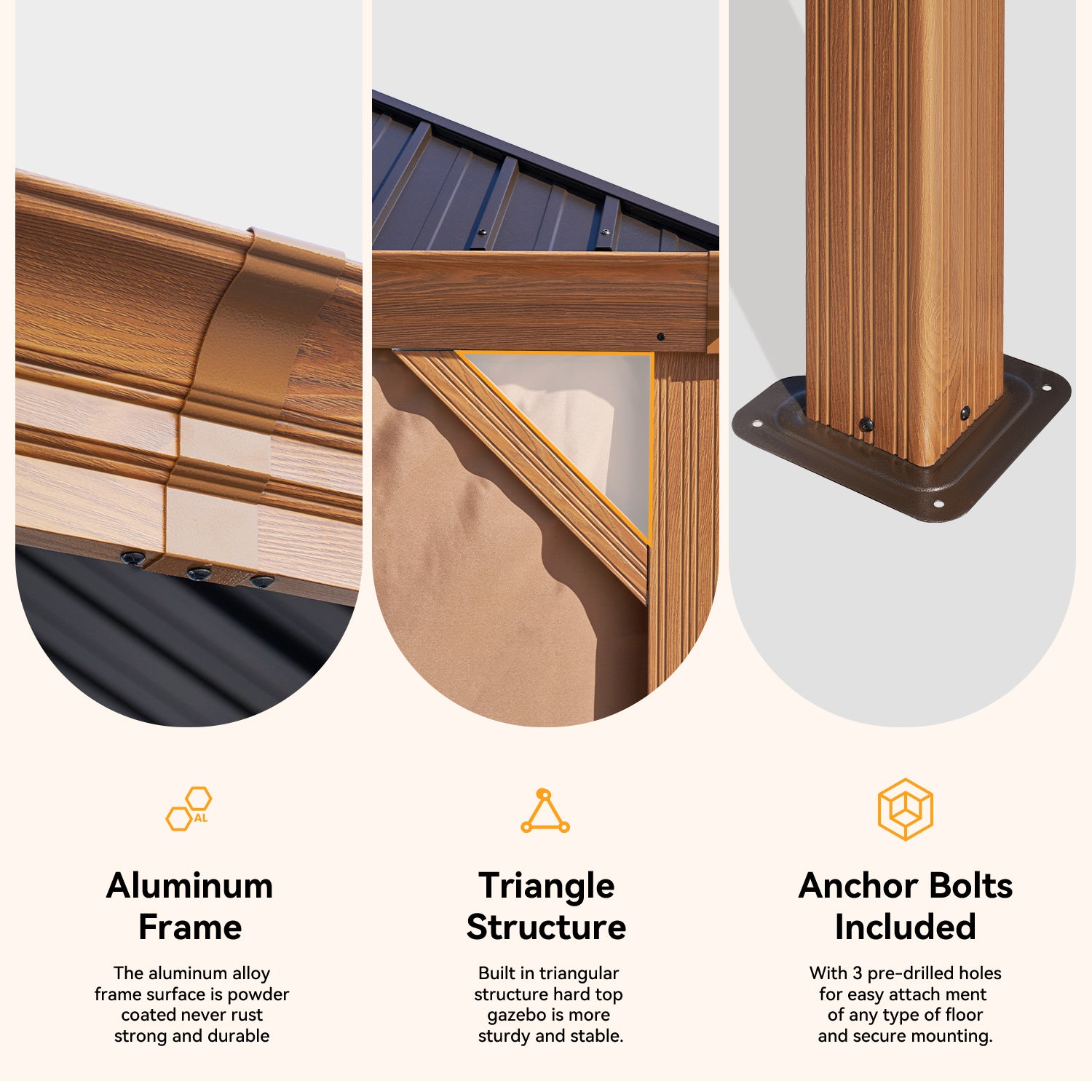- The sturdy, permanent gazebo features a high-quality, powder-coated aluminum frame that is strong and durable enough to withstand heavy snowfalls and strong winds.