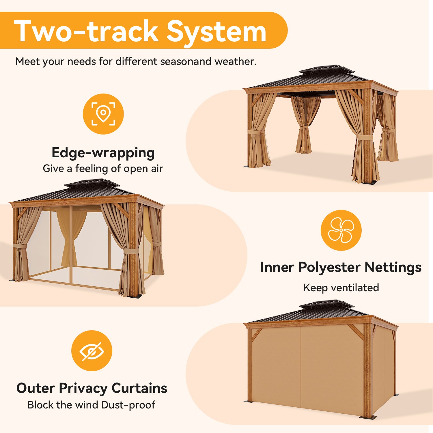 - Double-skinned metal gazebo with curtains and netting for added privacy for backyards, pools, and lawns.