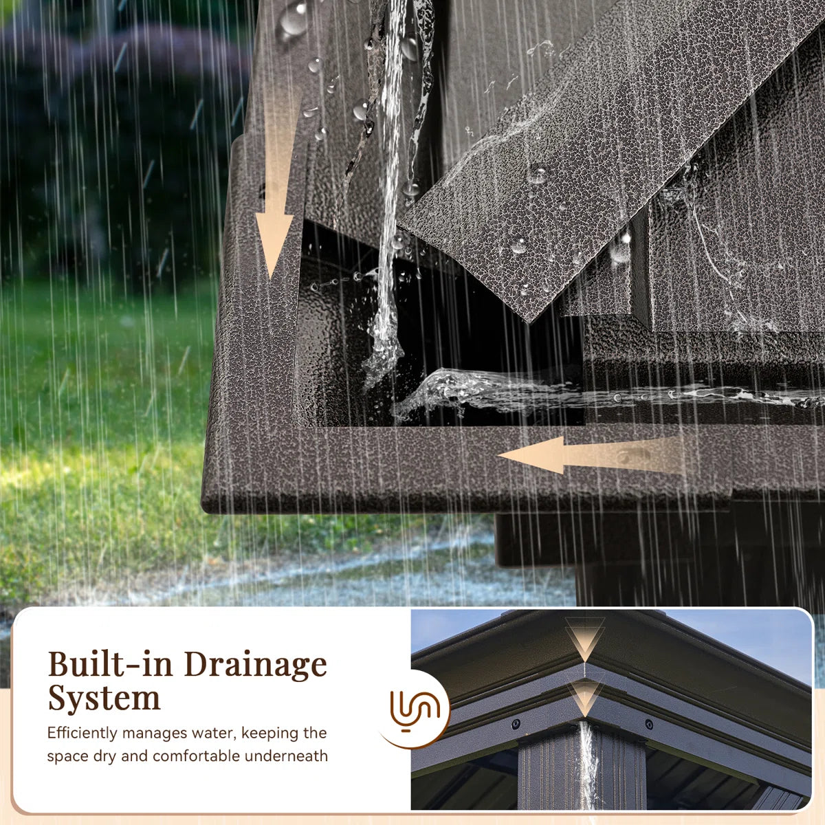 - Galvanized Steel Double Top: The double top design increases the stability of the gazebo and also provides better airflow and ventilation. The galvanized steel roof can withstand heavy snow, rain, or wind weather. The design enhances the overall aesthetic appeal of the gazebo.