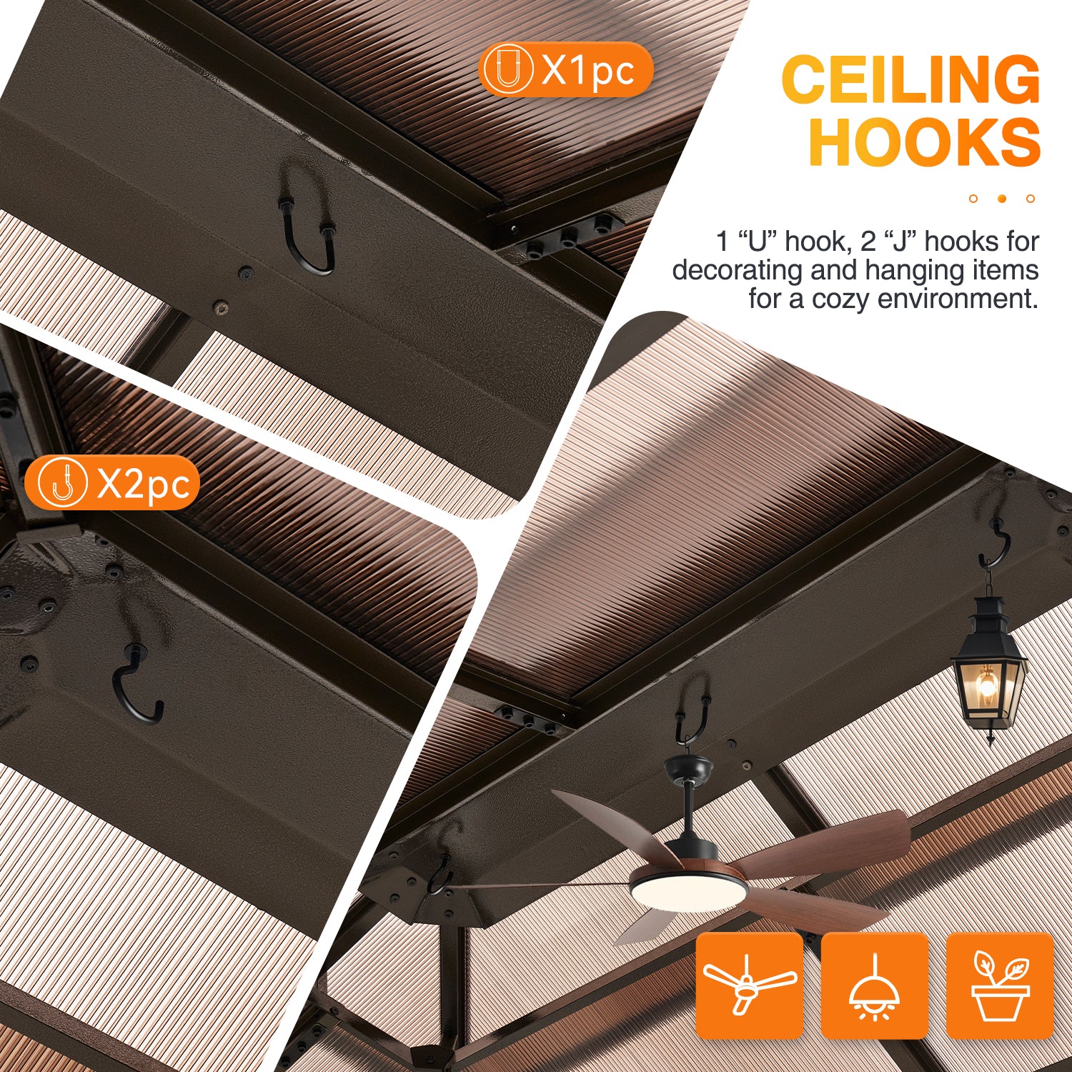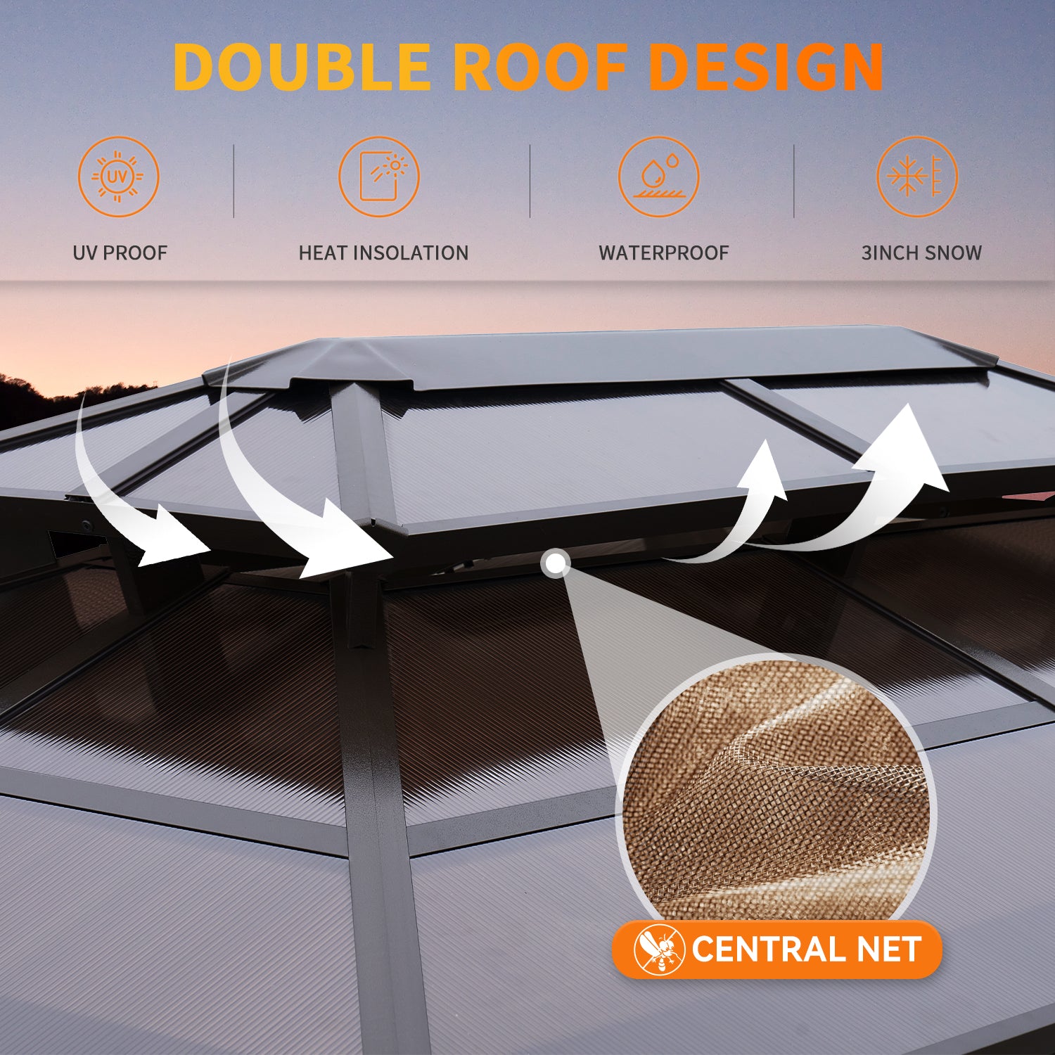 - Double Roof Design: The unique double-layer polycarbonate roof combines style and functionality, effectively blocking harmful UV rays while ensuring proper ventilation and stability. It also allows natural sunlight to filter through, providing gentle illumination. This hardtop gazebo creates a comfortable shaded area for grilling and outdoor cooking on hot summer days, while also offering reliable protection during rainy weather.