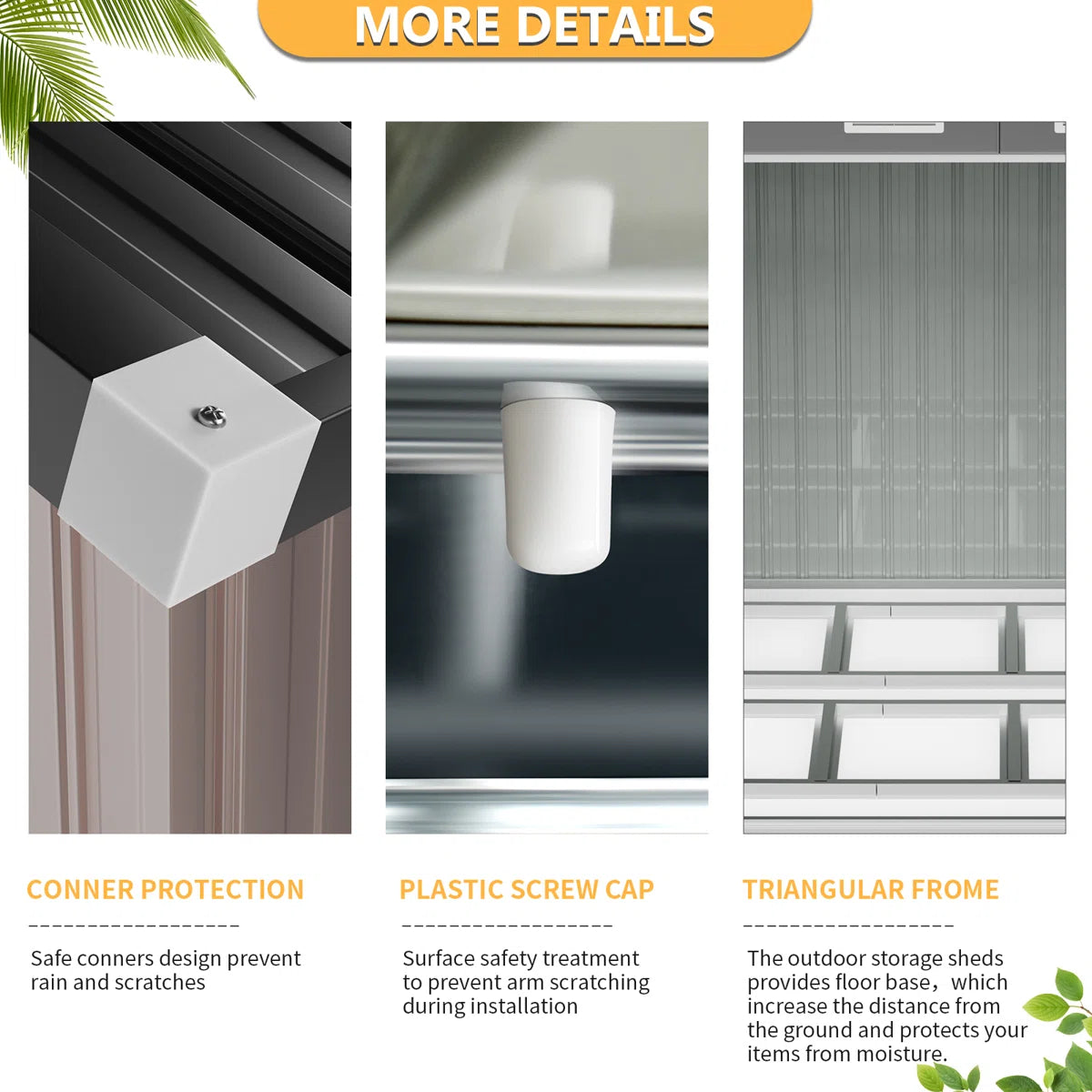 - Premium Construction for Durability: The tool shed is crafted from high-quality materials, including color-coated panels and galvanized steel. This ensures that it is not only robust and durable but also features anti-collision protection and screw protection covers for added longevity.