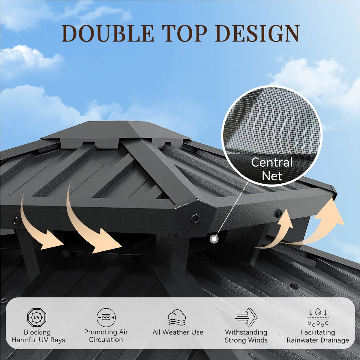 - The double roof provides air vents and the mesh screen at the top insulates against flying insects. The hard roof is suitable even in winter, and the roof can provide a load of 2500 lbs. Thickened powder coating ensures rust, corrosion, and chip resistance. Triangular design provides structural stability. Reinforced aluminum material provides greater load-bearing capacity and durability when anchored to the floor.