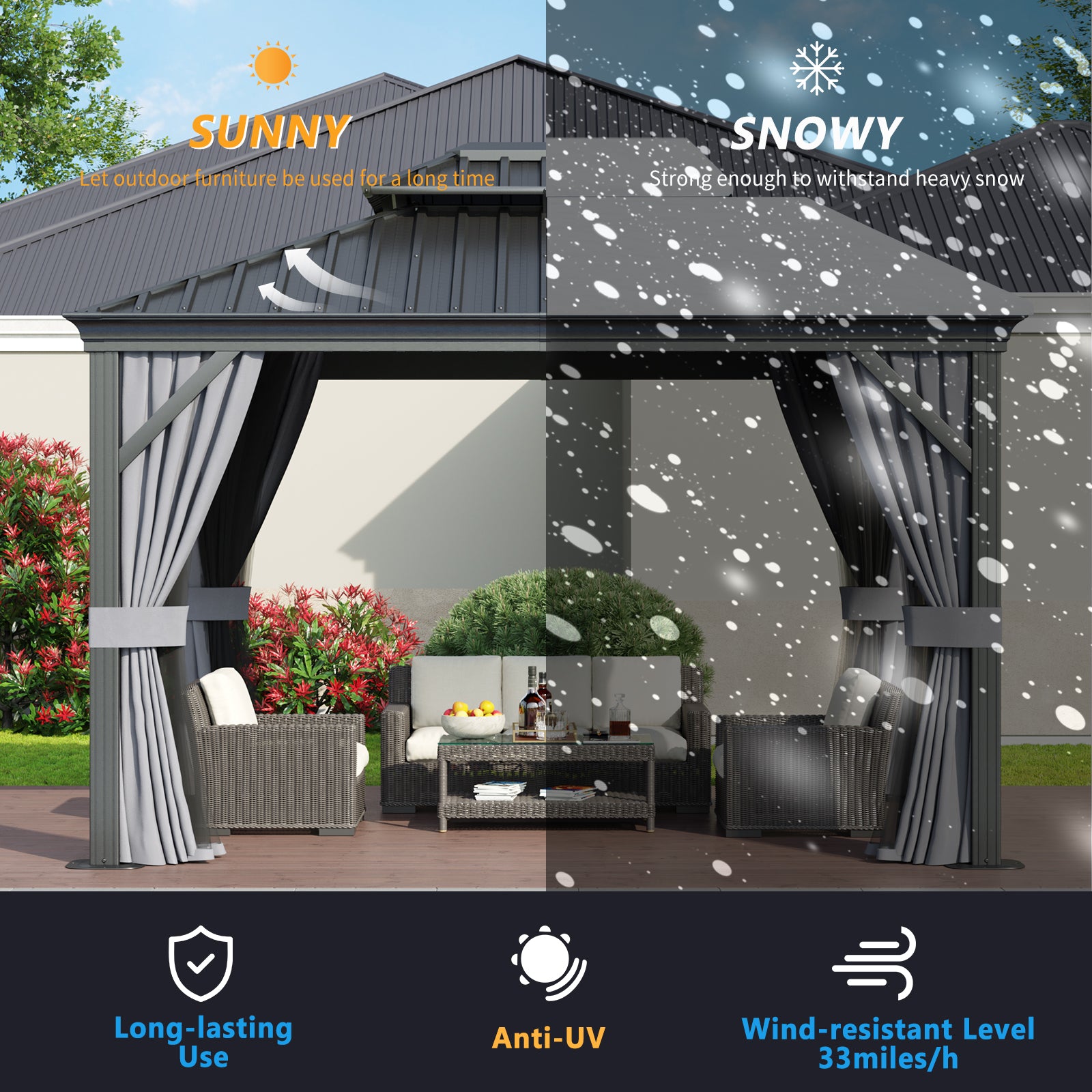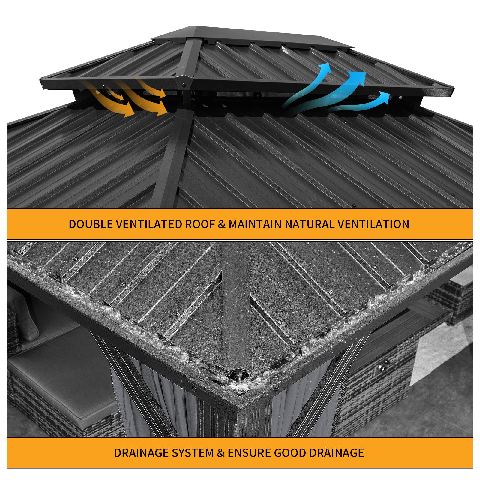 - Galvanized Steel Roof And Gutter Design: This hardtop gazebo is constructed with a powder-coated, galvanized steel roof that is strong and durable enough to withstand harsh weather. In addition, the galvanized design makes it less likely to rust or corrode, greatly extending its lifespan. The professional drainage system is designed to allow water to flow from the top of the arbor to the columns and the ground, greatly reducing the problem of rain and snow accumulation.